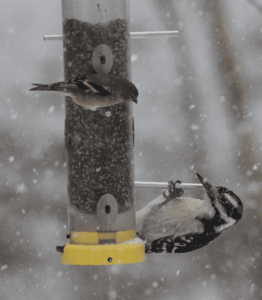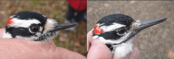It’s a gruesome thought, but when you see a woodpecker up close, try to imagine their bill being turned around 180 degrees then poked back into their head. If you think the tip of their bill would stick out of the back of its head then it’s a Hairy Woodpecker, but if it wouldn’t then it’s a Downy Woodpecker! Hairy Woodpeckers also appear to have a relatively larger and more square head.