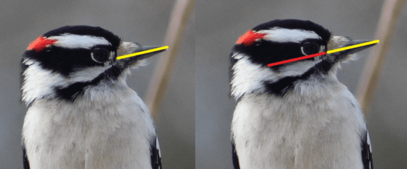 1) Bill length. A reliable way to tell the two species apart, especially at close range, is the length of their bill. Downy Woodpeckers have a very short, pointed bill and the fuzzy patch at the base seems disproportionately large. Hairy Woodpeckers have a longer, more chisel-shaped bill and a smaller tuft of nasal feathers.