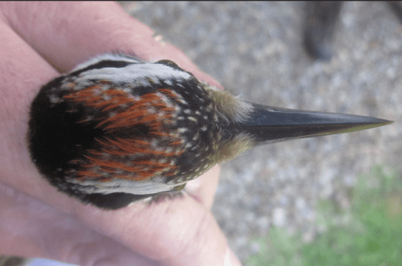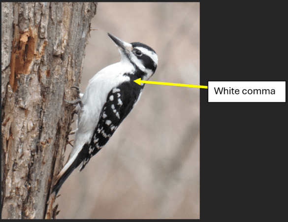 3) The white comma. Hairy Woodpeckers often show a white ‘comma’ at the bend of their wing, which is not present in Downys. However, the comma can be hidden if the bird’s feathers are fluffed up.