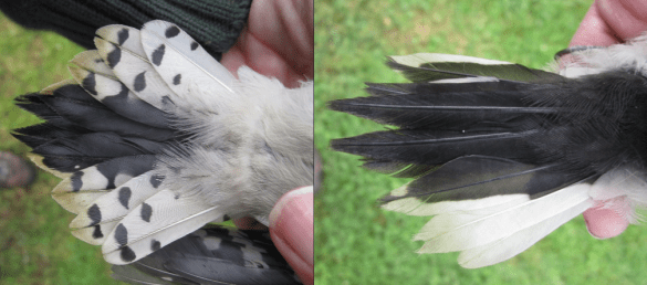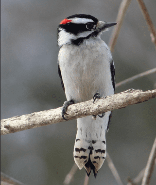 2) Outer tail feather color. The central tail feathers of both species are long and all black, whereas their outer tail feathers are white. However, the outer tail feathers of Downy Woodpeckers also contain black bars which are usually very visible. Woodpeckers often spread out their tails for support when they perch in trees which gives you a good opportunity to check out their outer tail feathers for black bars.