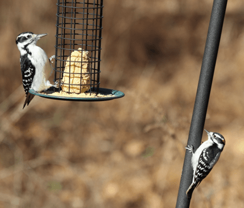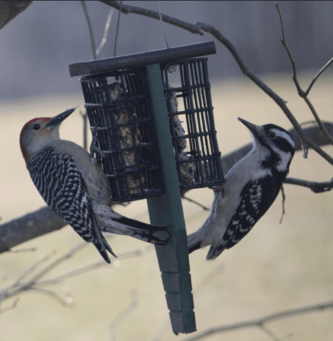 You can readily attract both these species as well as several other woodpeckers by putting out food, especially in the cold winter months. Woodpeckers have a particular fondness for suet cakes, suet blocks, and whole peanuts, but will happily eat black oil sunflower seeds.